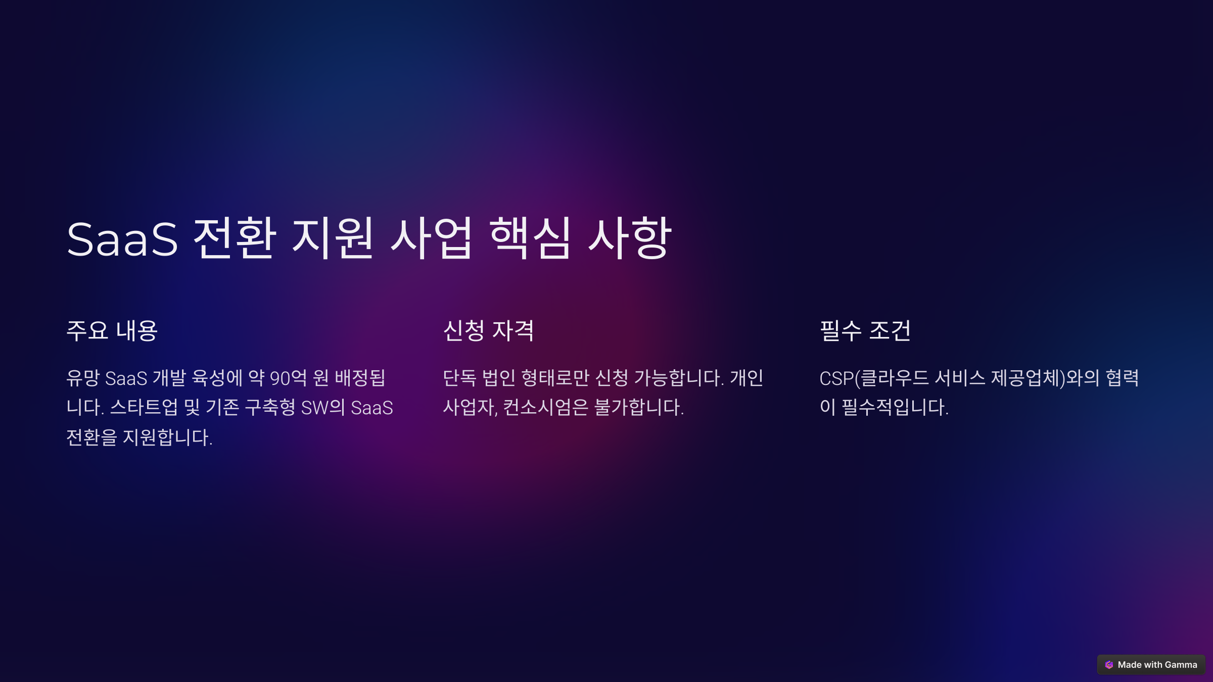 - 과제 수행 형태: 선정된 기업이 일정 기간 내 SaaS 전환을 완료해야 함
