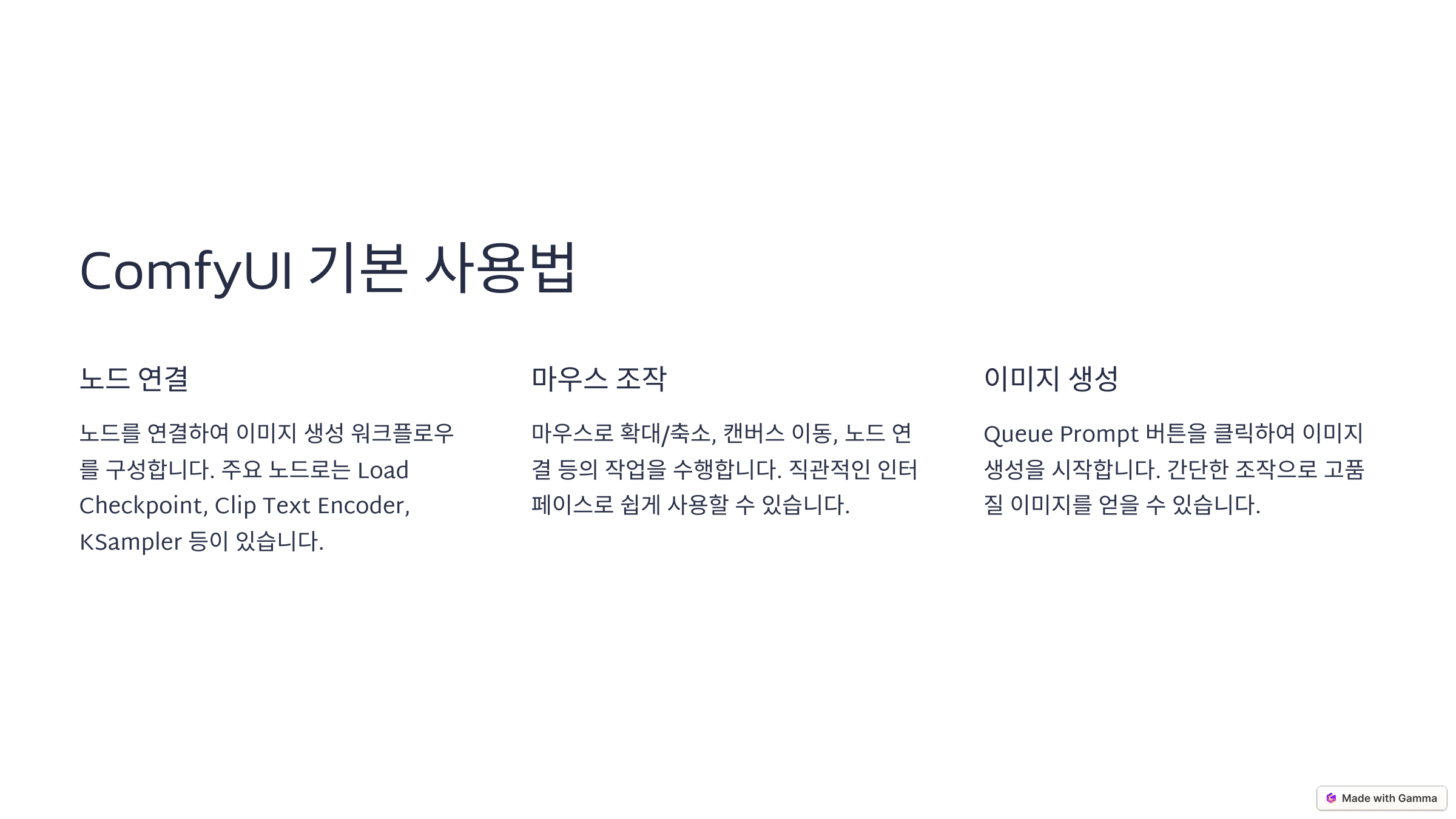 ComfyUI는 처음 접하면 다소 복잡하게 느껴질 수 있지만, 기본적인 흐름을 이해하면 쉽게 활용할 수 있습니다.