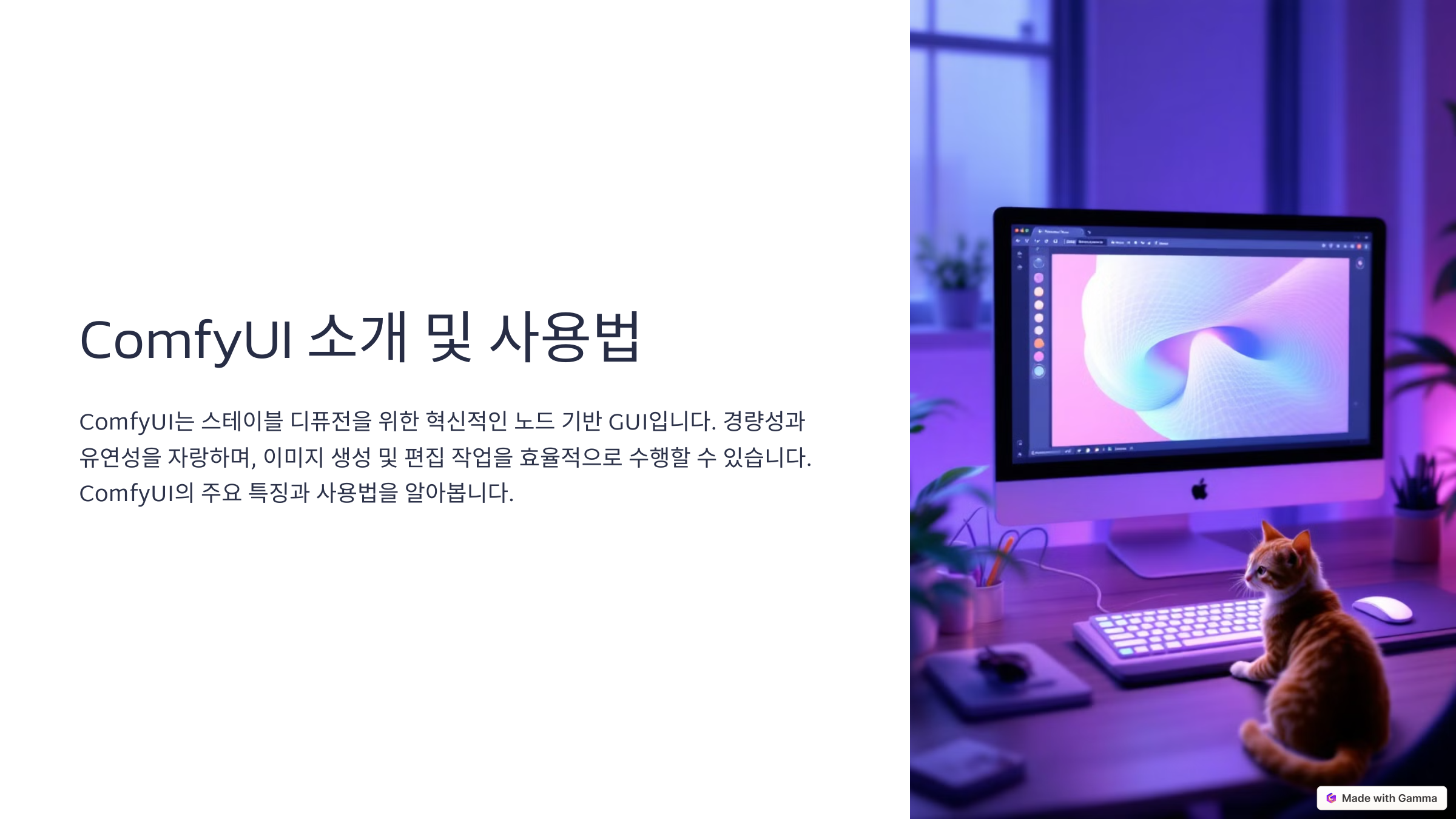 - ComfyUI는 Stable Diffusion 기반의 노드 시스템을 활용한 AI 이미지 생성 도구